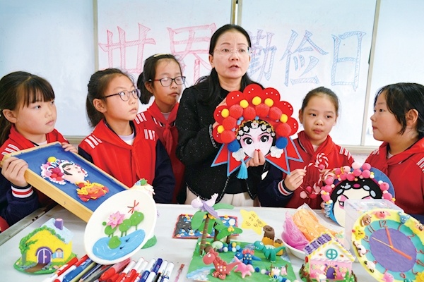 10月27日,郧阳区柳陂镇中心小学学生正在用废旧物品制作京剧脸谱等工艺品。为迎接“世界勤俭日”,该校开展“勤俭节约、变废为宝”主题活动,老师指导学生利用废旧报纸、挂历、塑料、橡皮泥等物品制作手工艺品,引导孩子们从小养成“保护资源、勤俭节约”的好习惯。通讯员唐华英摄