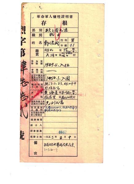 端详这份“革命军人牺牲证明书存根”,可以获知:1953年3月23日,中国人民志愿军63军188师563团7连战士郭俊成在作业时被炸伤后牺牲,时年21岁。他是湖北省随县天河口区四十里冲乡罐口村人,1949年5月入伍,1950年1月入团。牺牲后安葬在朝鲜民主主义共和国黄海道平川郡凤岩里南北山坡村。他的遗族负责人是哥哥刘成富,遗物有人民币65万元(注:第一套人民币1万元可兑换第二套人民币1元)、抗美援朝纪念章1个、剿匪纪念章1个。另有2支破水笔和1本纪念册。他的“革命军人牺牲证明书”编号是4662,填发日期是1953年5月10日。