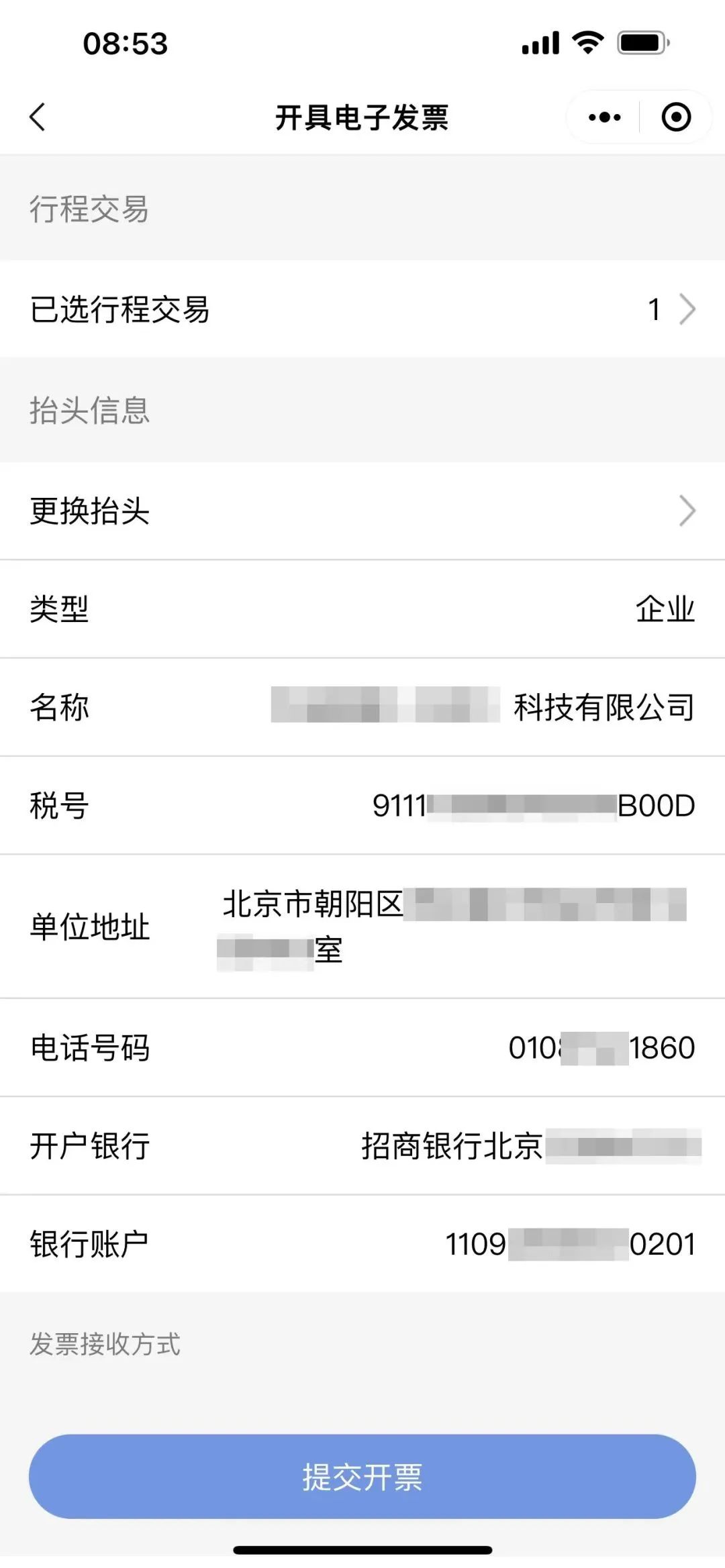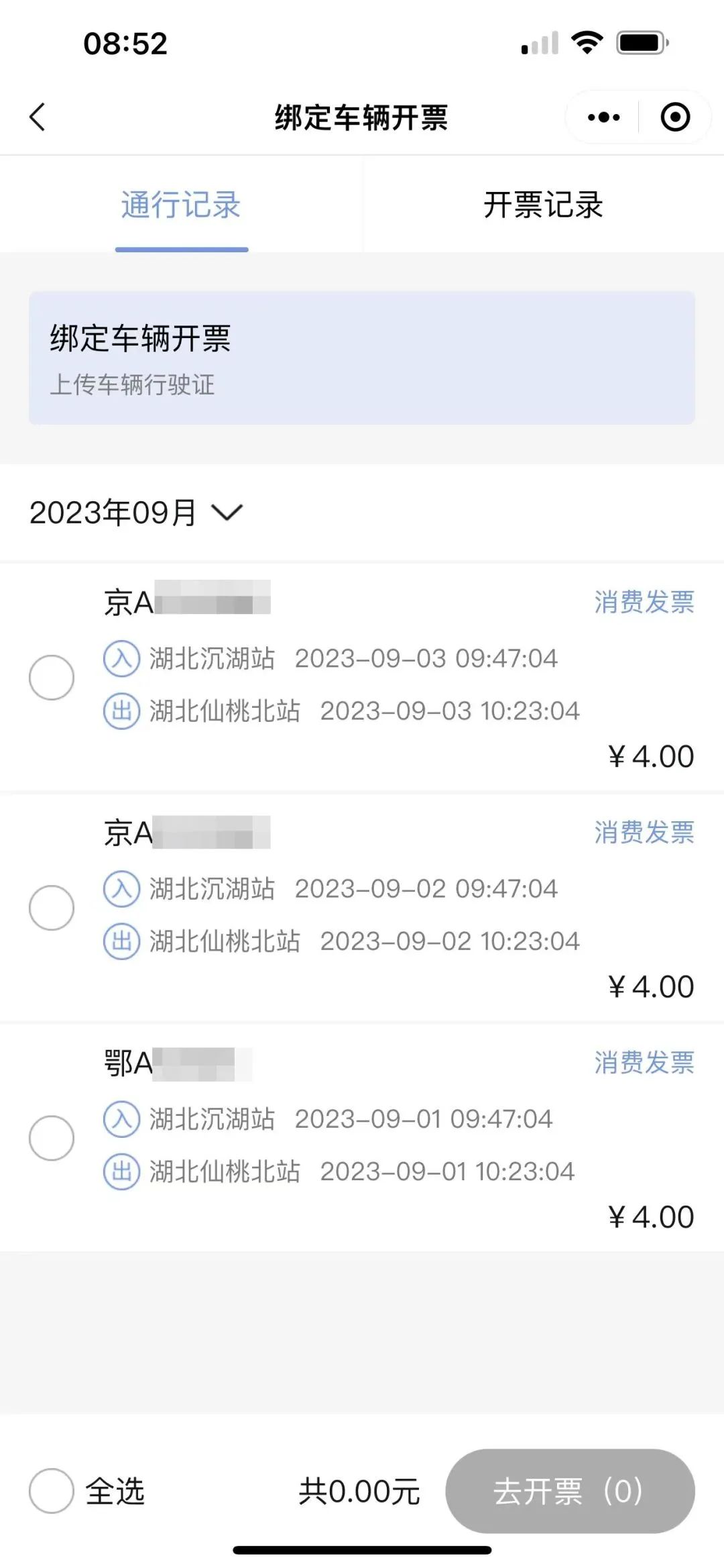 前提是通过“车辆管理”功能绑定了待开发票通行车辆的车牌,选择车牌号查询该车牌下的通行记录,选择通行记录进行开票。