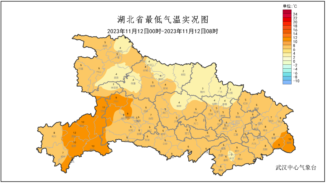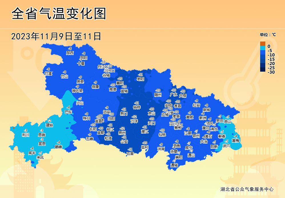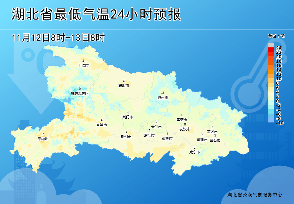 昨日(11日),全省大部以小雨为主,十堰、神农架高山地区局部有雨夹雪或雪,我省北风依然强劲,大部地区阵风达6~8级。在冷风阴雨的联手打压下,我省48小时平均气温下降8~12℃。