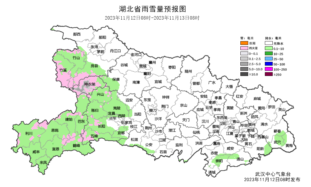 鄂西北南部、鄂西南小雨转多云,高山地区局部有雨夹雪或雪;其他地区阴天到多云。