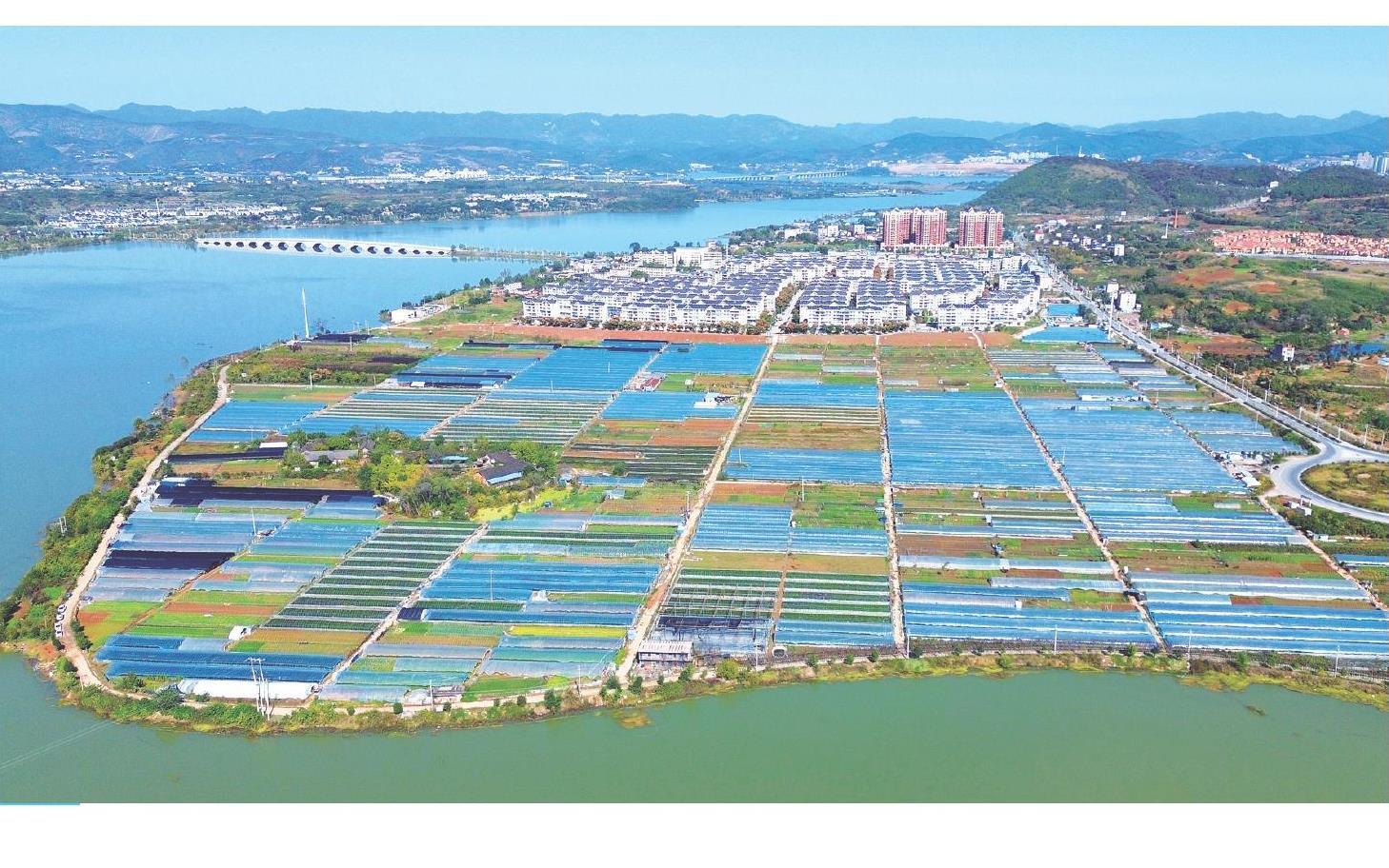 11月6日,记者在郧阳区柳陂镇看到,农田里农业大棚铺排开来,与碧水、村庄、道路相映成趣,构成一幅田园美景图。近期,当地农民抢抓农时,为农业大棚披上新塑膜,确保果蔬“温暖过冬”,保障冬季市场供应。特约记者杨显有摄