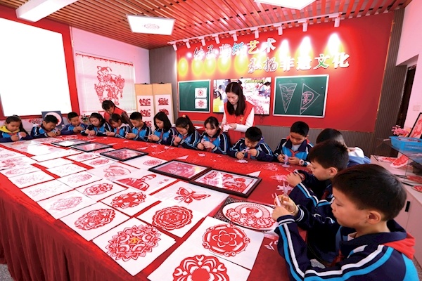 11月8日,竹山县麻家渡镇柿树坪小学师生正在创作剪纸作品。2014年3月,该校将非遗剪纸引入校园,确立剪纸育人特色校园文化品牌。历时9年深耕,该校形成“人人学剪纸,人人出作品,代代传非遗”的“一校一品”特色。经过周周练、月月练,孩子们能够自主设计剪纸作品,逐步掌握以剪、刻、镂空为主的剪纸技法,对非遗文化进行传承与创新。该校被竹山县文化和旅游局命名为县非物质文化遗产传承基地(堵河剪纸传承基地)。特约记者朱本双通讯员蔡春芳摄