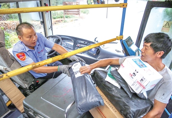 王付先(左)为村民提供免费转运快递服务(资料图片)。