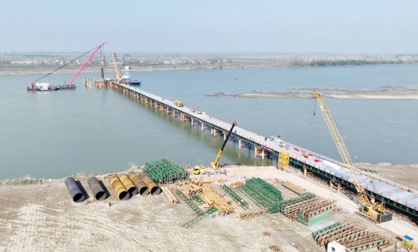 连日来,武荆宜高速公路沙洋汉江特大桥一派繁忙景象,施工人员正在加班加点吊装钢护筒、搭建钢栈桥。据介绍,武荆宜高速荆门段东起荆门、天门交界处的吕家潭村,西至沙洋县五里铺镇郝台村,途经钟祥市旧口镇、沙洋城区北、曾集镇、五里铺镇,全长44.652千米,概算投资82.4亿元。沙洋汉江特大桥是武荆宜高速公路重要节点工程,全长2620米,主跨长660米,采用2×330米独塔钢·混组合梁斜拉桥设计。截至目前,钢栈桥工程量完成87%,计划11月18日开始汉江特大桥主墩桩基施工。(记者 朱俊波 通讯员 何志华 摄)