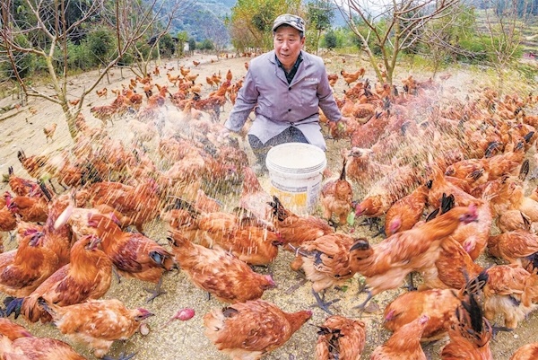 11月14日,在竹山县双台乡南口村鑫茂生态农业园,工人在给林间散养的鸡投喂饲料和青菜。近年来,双台乡采取“地标保护+环境监测+疫情防控+种苗筛查”四位一体管理模式,严格质量标准,发展2000只以上养鸡大户15家。该乡每年出售鸡10万只、鲜鸡蛋400吨,除满足本地肉蛋商品供应市场外,还俏销陕西、河南、江苏等地多个大型商超。