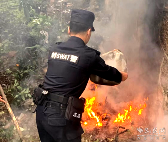 同时,民警利用警用器材清理出防火隔离带,预防阻止火势蔓延。最后,民警们在火堆周围进行仔细检查,再三确认安全隐患彻底消除后才放下心来。