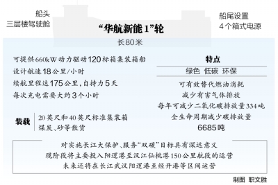 轮机长吕毅介绍,“华航新能1”轮设计航速18公里/小时,可装载20英尺和40英尺标准集装箱,也可以装载煤炭、砂等散货,具有“绿色、低碳、环保”的特点,可有效替代燃油消耗,减少有害气体排放。该船配置4块方形电池,续航里程达175公里,自持力5天。每次充电需要大约3个小时。