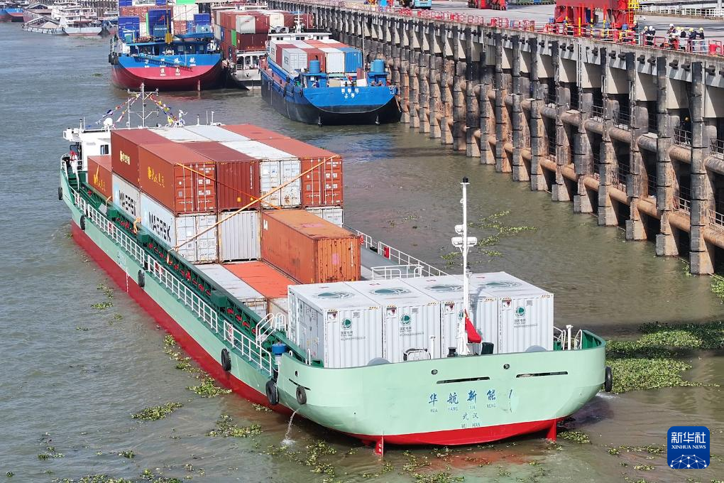 当日,汉江首艘纯电动集装箱示范船“华航新能1”在湖北武汉首航,由此开启汉江航运的电化时代。