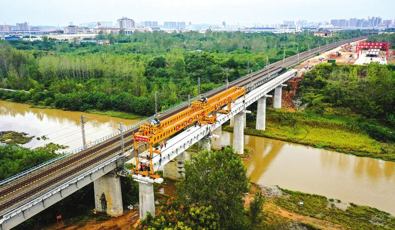 国能长源随州电厂铁路专用线路基、桥涵、铁轨等多点并进,建设全面铺开。该项目于汉丹铁路随州站既有牵出线K164+984.39处接轨引出,并行汉丹铁路东侧武汉方向前行进入随州电厂,线路全长13.47公里,目前已完成投资2.87亿元。图为漂水河特大桥施工现场。 (随州日报全媒记者李文军摄)