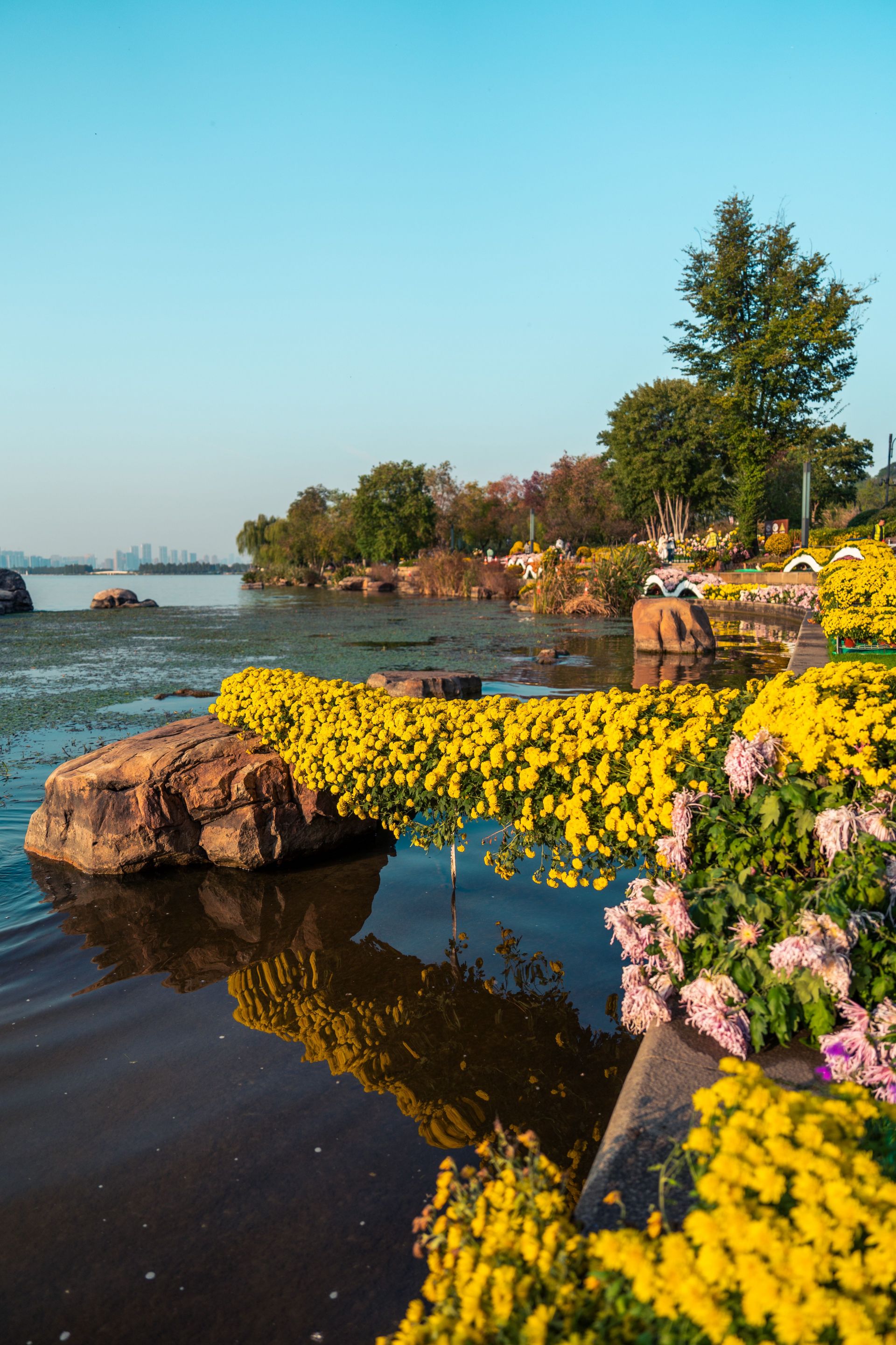 东湖风景区东湖绿道全景广场菊展区,设计师充分利用优美的湿地环境,沿着湖岸布置了各色自然花境。悬崖菊化身“菊花桥”,借助岸边的礁石,将菊花延伸至水中,营造水中看花的景象。在湖水映衬下,菊花倒影曼妙婆娑,与秋色融为一体。
