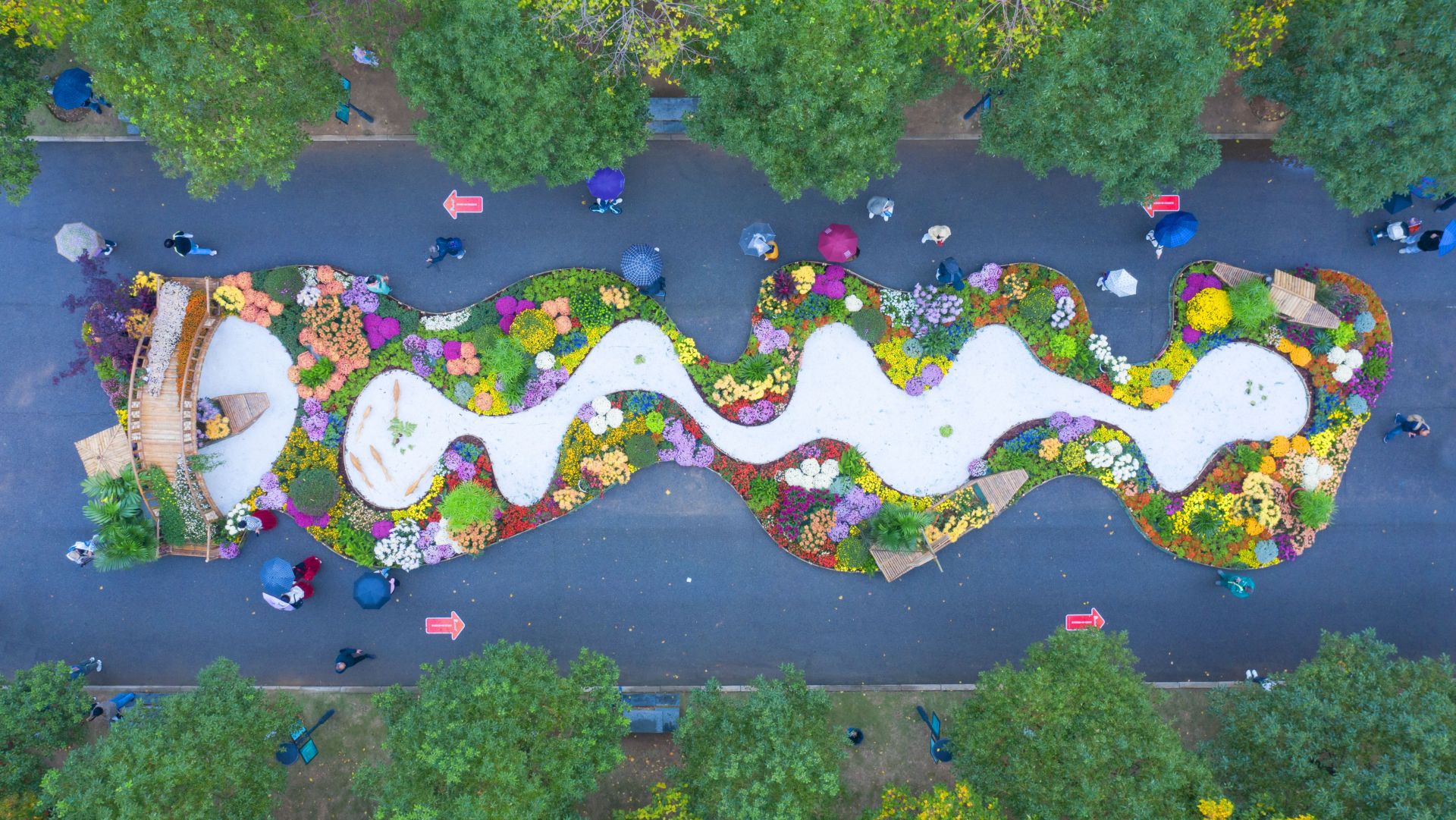 黄鹤楼公园东门前,一盆盆菊花似瀑布倾泻,顺着阶梯飞流直下。沙湖公园C区内,竹子编织的小桥上,彩色的菊花如涓涓流水,淌出一条缤纷花路。这种气势磅礴、造型独特的菊花,就是悬崖菊。