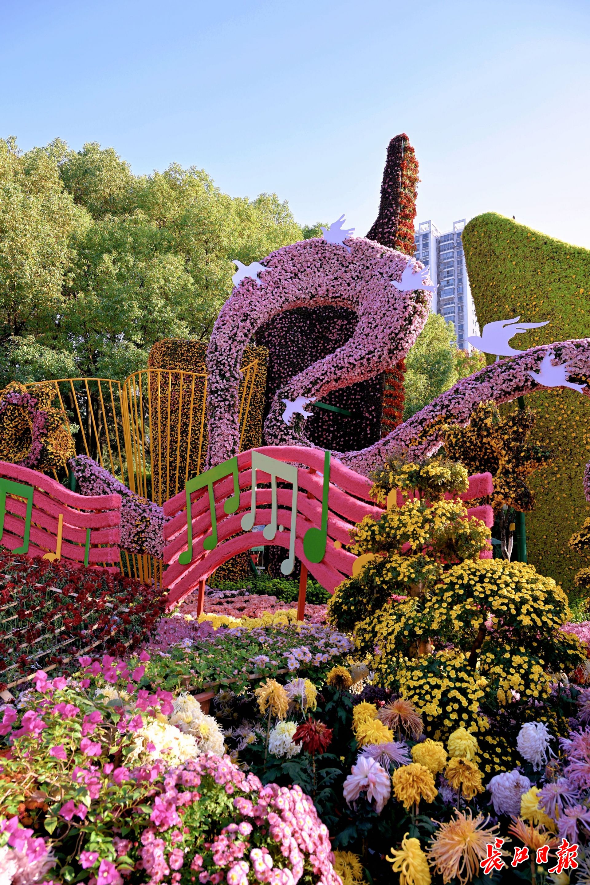 长江日报记者来到汉阳区琴台绿化广场菊展区,6万盆菊花点缀其中,如同打开一幅色彩斑斓的画卷。穿过由乒乓球菊、一串红、彩叶草打造的花径,便可看到一个高达8米的主景。经典的喇叭花、乐鼓、五线谱与音符等元素运用其中,一条由菊花织成的粉色“丝带”灵动十足。该展区设计师伍贤章告诉记者,除了园林小景、微型花境等造景手法,今年汉阳区菊展区还在部分景观上运用了绿雕工艺,使用的菊花也从丝菊、多头菊换成了更小更精美的千头菊,这意味着菊展的造型可以更突出、更丰富。