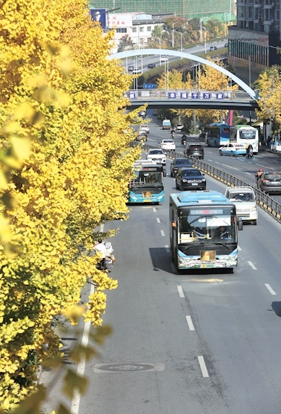 近日,十堰开启连晴模式,大街小巷高大挺拔的银杏树舒展着满身的枝条,以微醺的姿态轻轻摇曳金色的叶子,给城市带来了无尽的诗意和浪漫。在灿烂的阳光中,北京北路阳光栖谷路段的银杏生出耀目的金黄,呈现出一派浓浓的深秋景象。图/记者张 启国