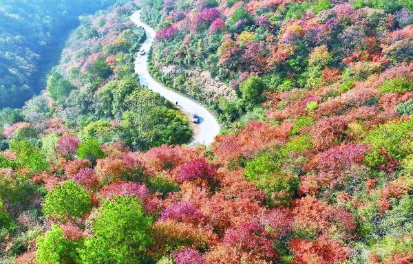 连日来,荆门天气晴好,漳河新区漳河镇团坊村通村公路周边山坡上的黄杨、乌桕、山胡椒等树木迎来最佳红叶观赏期,红红的树叶与常绿树木、水面、道路交相辉映,如同一幅美丽的画卷,吸引不少市民前来打卡。(记者 朱俊波 通讯员 韩青 摄)