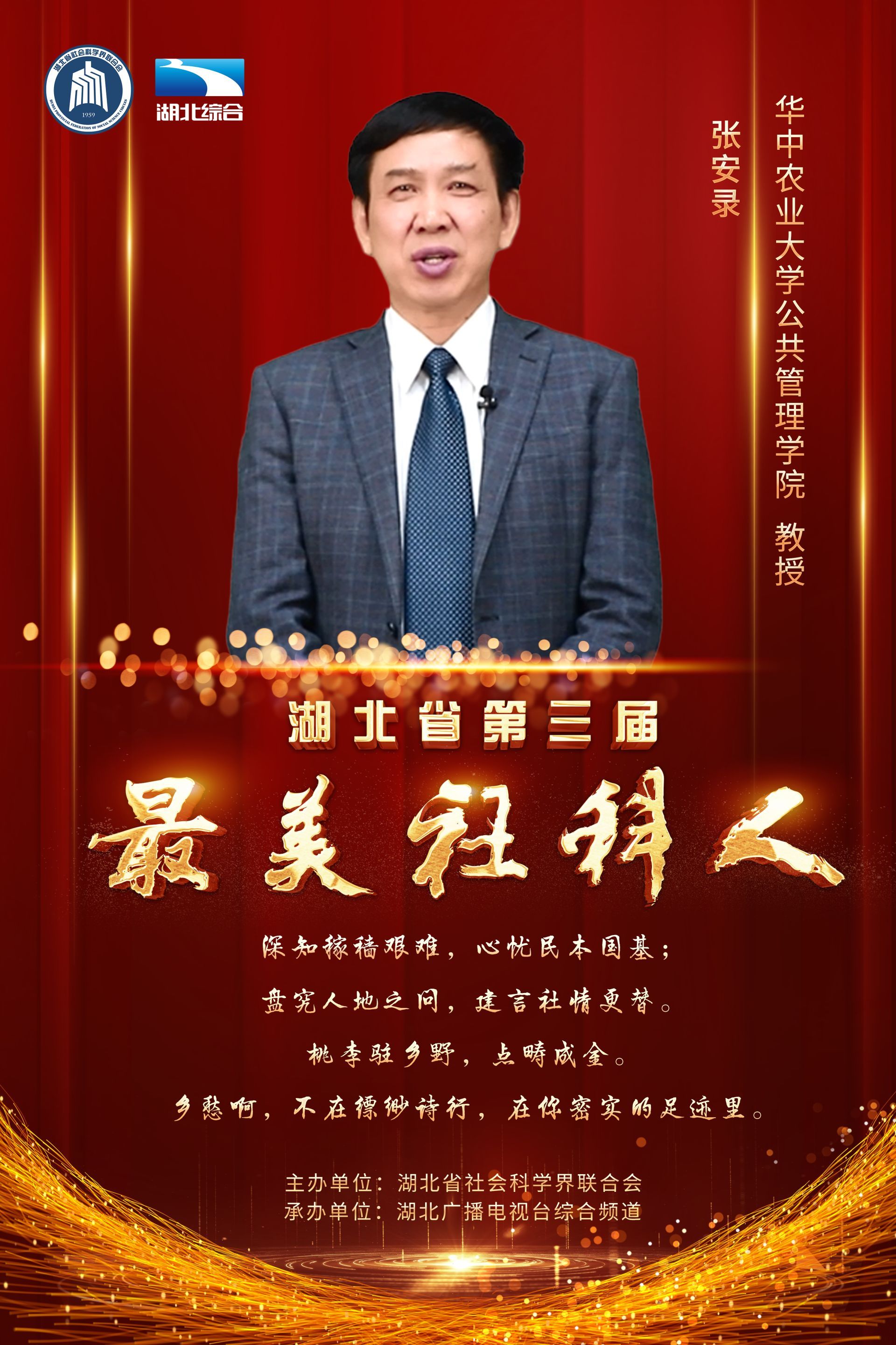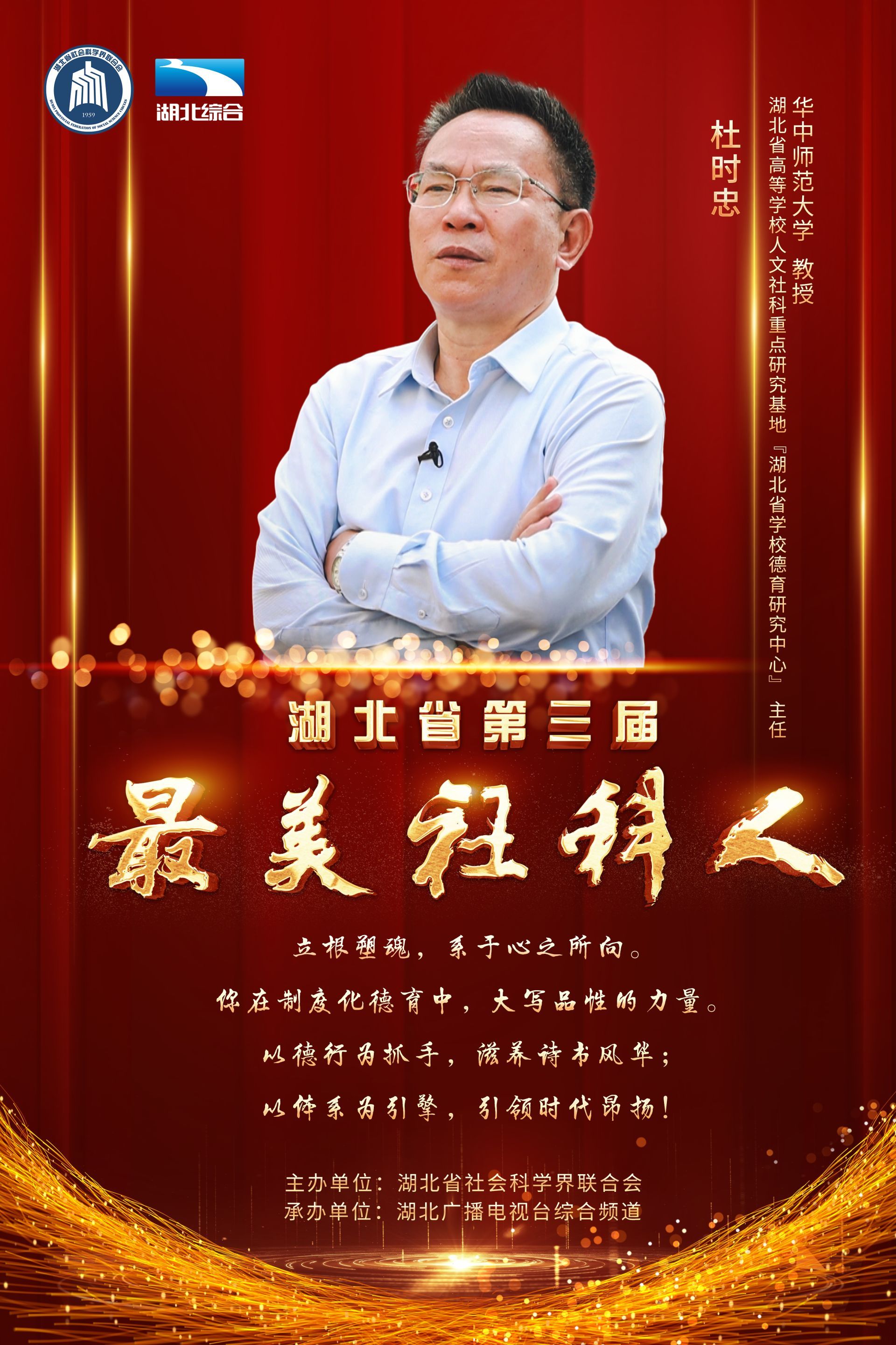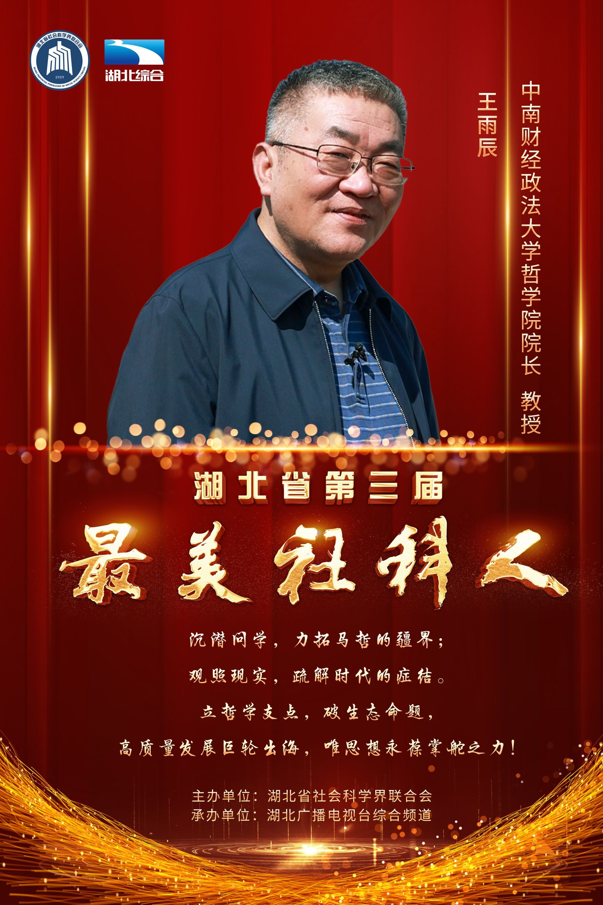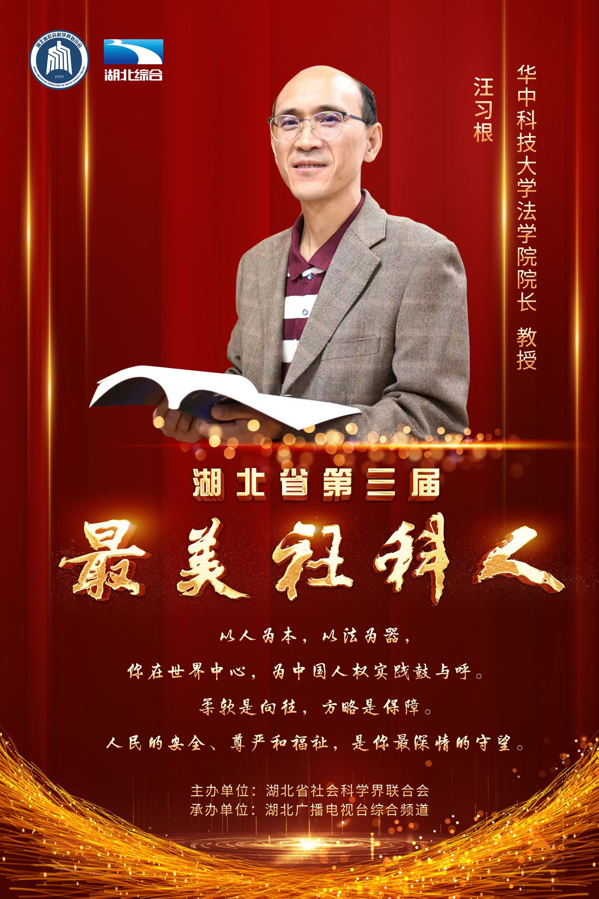 肩负使命,培根铸魂育人;潜心笃志,学思润泽荆楚。11月20日下午,由湖北省社会科学界联合会主办的“第三届最美社科人发布仪式”在湖北广播电视台演播厅成功举办,王雨辰、田传茂、杜时忠、李建中、李莉、汪习根、张安录、孟华平、荣开明、郭国祥等10位社科工作者荣获“最美社科人”称号。湖北省委常委、宣传部部长琚朝晖出席发布仪式,并为获奖者颁奖。