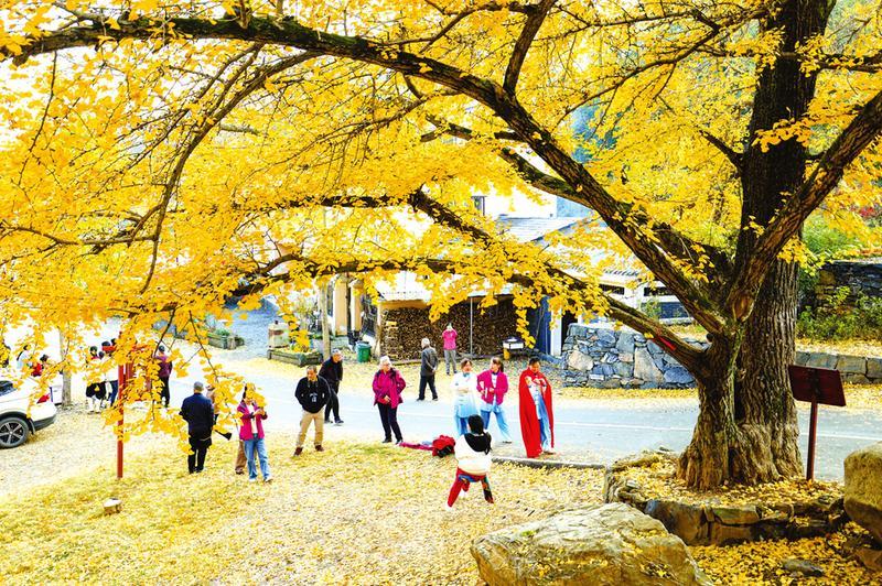 当前正值赏银杏的最好时节,曾都区洛阳镇古银杏群落到处是一片金色的海洋,吸引了省内外众多游客自驾前来观赏。图为11月26日,游客在胡家河村观赏银杏。 (随州日报全媒记者李文军摄)