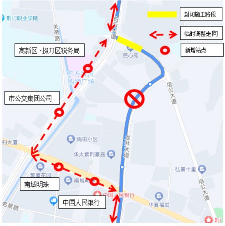 因培公大道(城市春天及半山豪苑大门口至掇刀区税务局)路段将进行全封闭施工,为保障市民正常安全通行,市交通运输局决定将途经封闭施工路段的26路、59路两条公交线路在道路封闭期间运营走向进行临时性调整。调整方案如下: