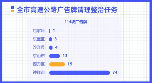 多维发力,加速推进。对全市114块需拆除广告牌按照档案管理模式及“一牌一档”原则,逐块进行点位确认,建档立卡;建立高速公路广告牌拆除微信工作群,与省厅工作专班和县市区工作专班对接,每日调度,互通情况;按照“任务、时间、责任”三张清单,每日调度通报,逐个广告牌跟踪销号,确保工作推进见行见效,按期完成清零任务。