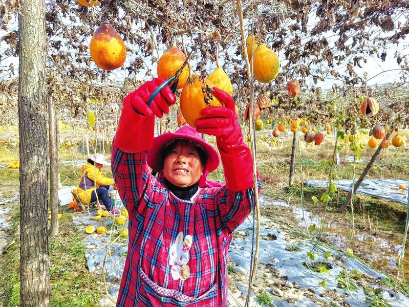 基地里,十几个村民正在忙着采摘瓜蒌果。50多岁的陈秀芳经常到基地做工,瞅准成熟的果子,她拿着剪刀对着瓜蒂快速剪下,不一会儿,地上就堆了一大堆。“村里建了这个基地,我们在家的人可以到这里就近务工,既能照顾家庭,又增加了一笔收入,这个项目好!”她高兴地说。