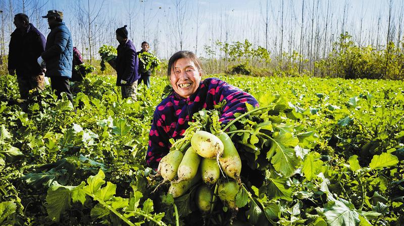 唐县镇鲁城村,农民正在采收当地特产“青壮头”萝卜,丰收的喜悦洋溢在每个人的脸上。(随州日报全媒记者李文军摄)
