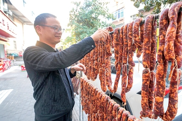 大雪节气到,又到了一年一度的腌腊季。近日,记者在老虎沟农贸市场附近的一家酒店门前看到,一个个架子上挂满了腊肠、腊鱼等腊味,暖阳照在一排排摆放整齐的腊肠、腊鱼上,呈现出一幅幅诱人的画面。图/记者 刘成臣