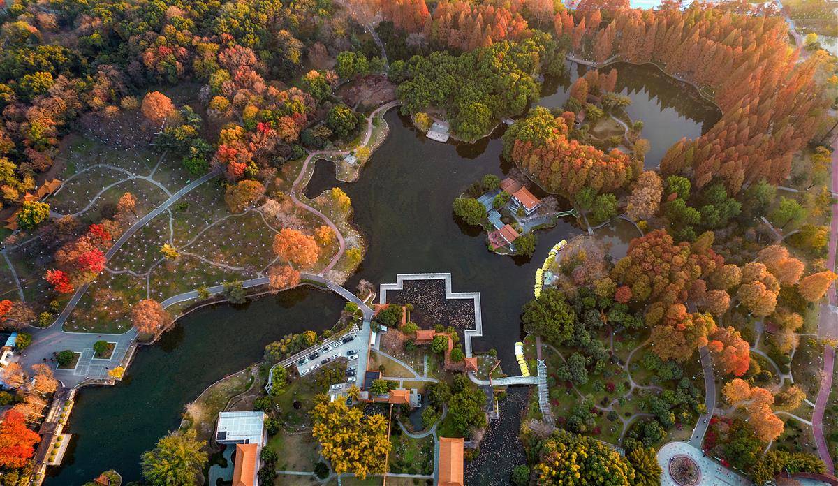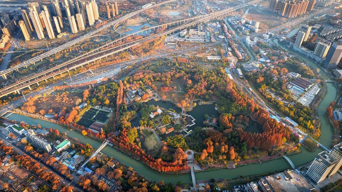 12月7日,夕阳西下,鸟瞰色彩斑斓的武汉青山公园,镜头下的公园整体呈三角形,被二号明渠、南溪和青山港合围而成,通过跨河桥与外界连通。