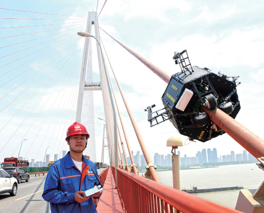 2022年5月7日,在武汉白沙洲长江大桥上,“探索者”机器人在斜拉索上快速“爬行”,仅仅10分钟,长达300米的一根斜拉索就完成了检测。与此同时,在岸边的人行道上,技术人员通过相关智能平台终端,保持对拉索的外观状态和内部钢丝健康情况的监测。