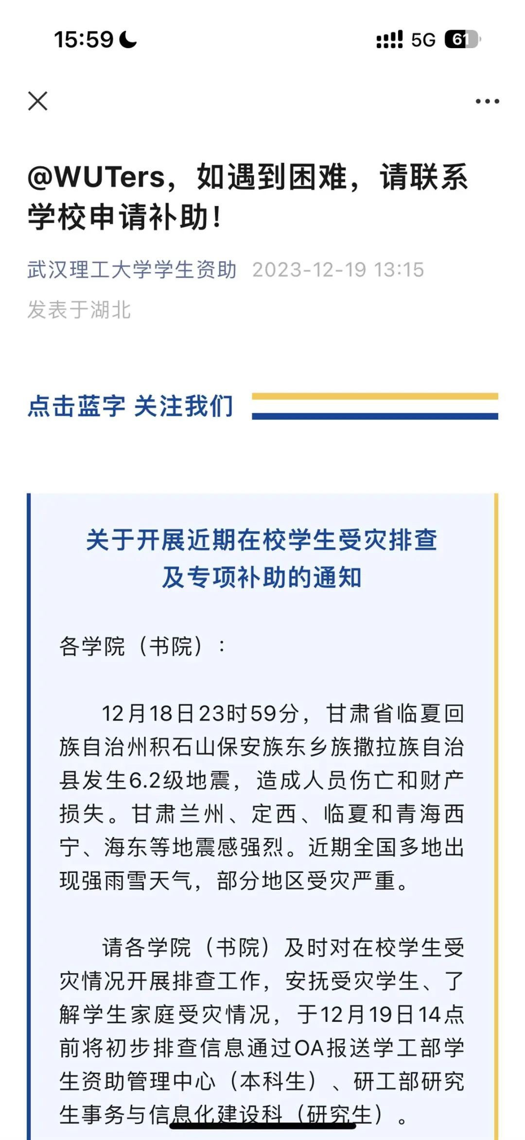 12月18日23时59分,甘肃临夏州积石山县发生6.2级地震,震源深度10公里。截至目前,地震已造成多人伤亡,部分水、电、交通、通讯等基础设施受损。近期,全国多地也相继出现低温雨雪天气,造成雨雪冰冻灾害,生产生活遭受影响。为及时帮助遭受自然灾害学生度过困难,保障其安心学习、正常生活,武汉大学决定启动自然灾害临时困难专项资助工作,通过学生本人提出或者辅导员推荐进行申请,经学生奖助中心审核后,学校将参照学生临时困难补助标准确认并发放补助金。