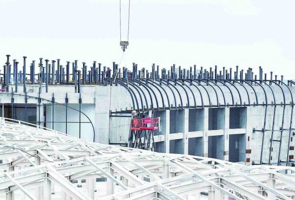 12月18日,荆门高新区·掇刀区文化体育中心项目工地上,工人正在安装主体工程外墙的造型结构。该项目为全市重点民生工程之一,建设内容包括文化中心、体育中心场馆、室外球场、市民广场等配套设施。(记者 张彩云 摄)