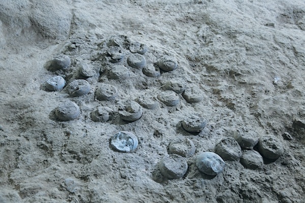 记者在遗址现场看到,3枚结晶恐龙蛋化石与周边28枚非结晶恐龙蛋化石构成了一个蛋窝。显露在外的晶体,让这3枚特殊的恐龙蛋化石在蛋窝里闪闪发光、格外引人注目。