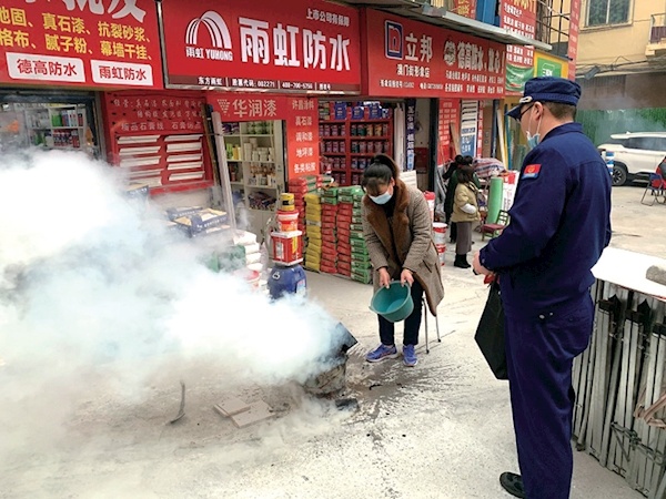 今年年初,消防人员进行日常检查时发现一名商户用明火取暖,现场要求对方将火熄灭,并提醒其他商户注意取暖安全。(资料图片)。