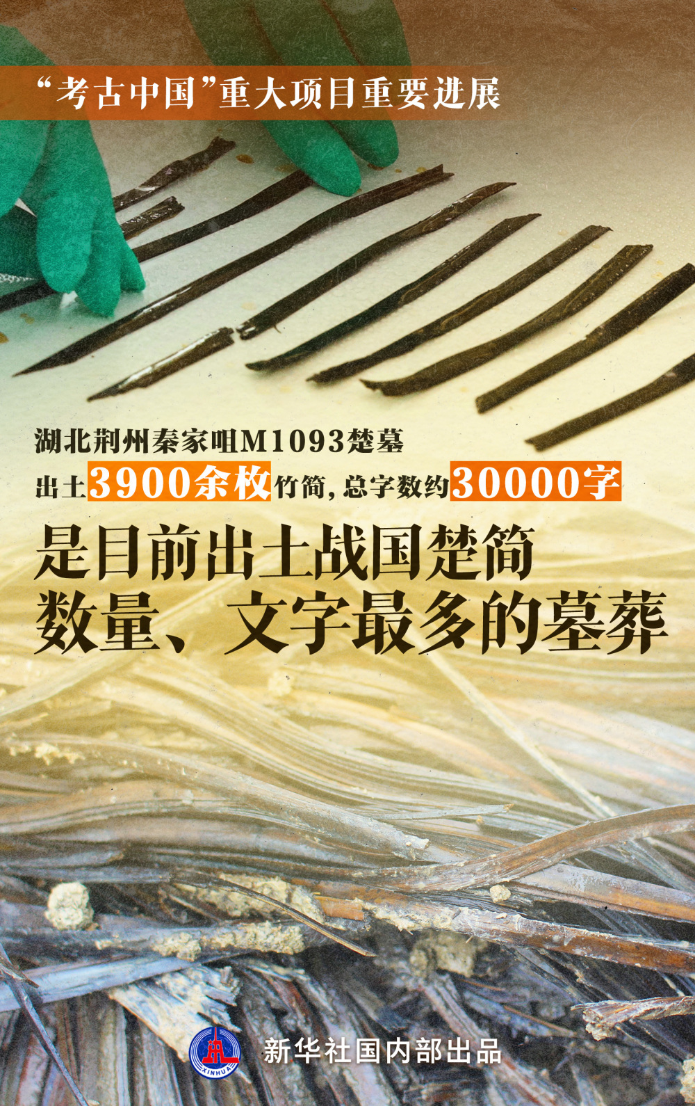 秦家咀墓地位于湖北荆州纪南生态文化旅游区,西距楚故都纪南城遗址约1公里,是一处东周时期墓地。其中M1093是一座战国时期的楚墓,出土大量竹简。经过荆州文物保护中心第一阶段室内保护处理,共揭取竹简3910枚,预计可缀合整简1200至1500枚,字数约30000字。