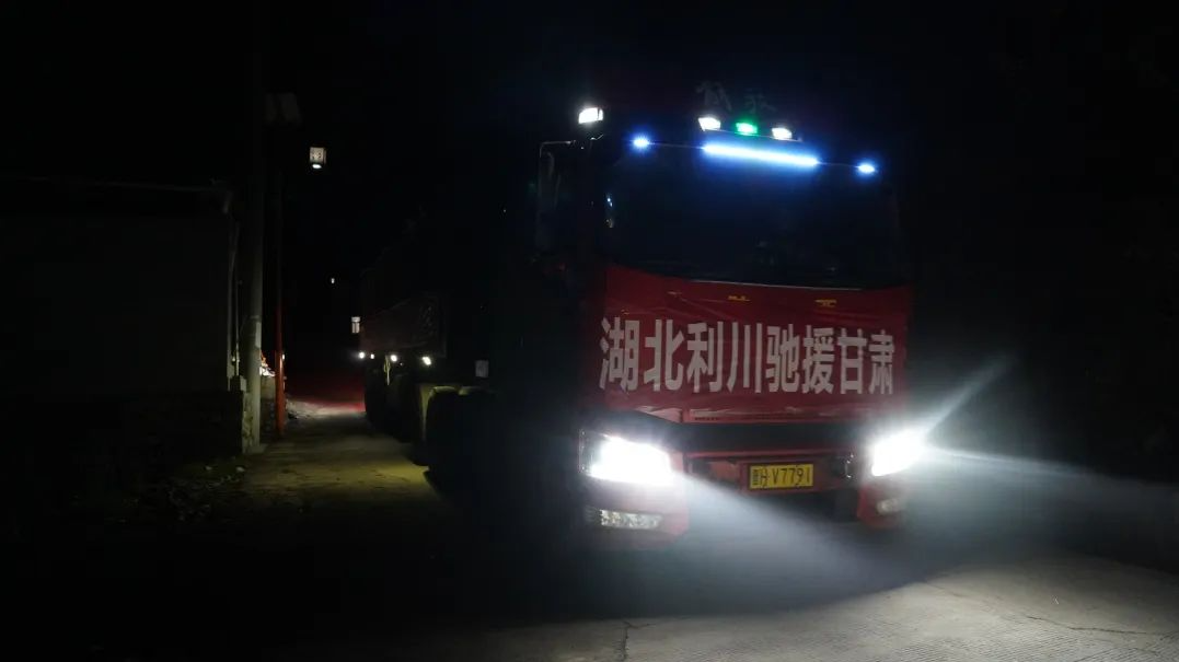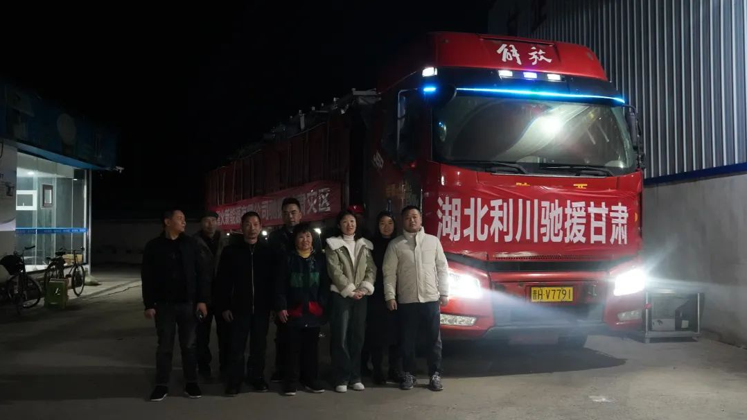 贴有“湖北利川驰援甘肃”横幅的物流运输车