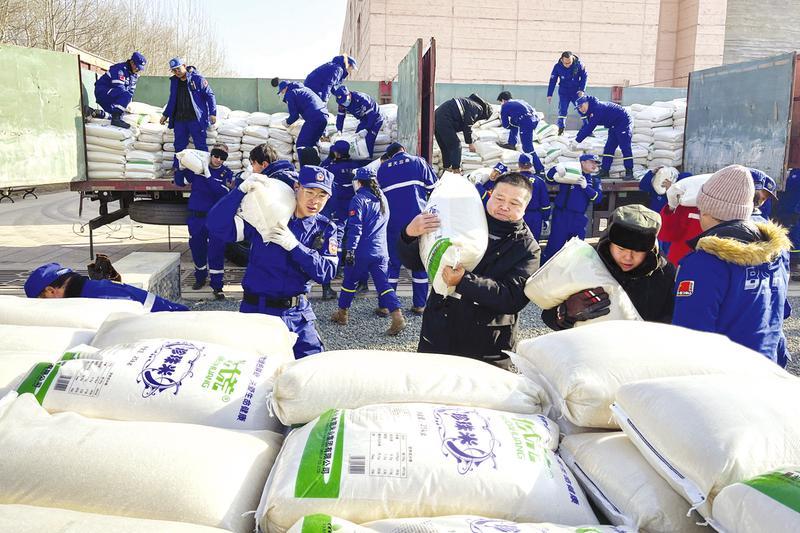 12月18日23时59分,甘肃省临夏州积石山县发生6.2级地震。灾害发生后,随州蓝天救援队紧急奔赴灾区参与救援。图为随州蓝天救援队员正在卸载救灾物资。