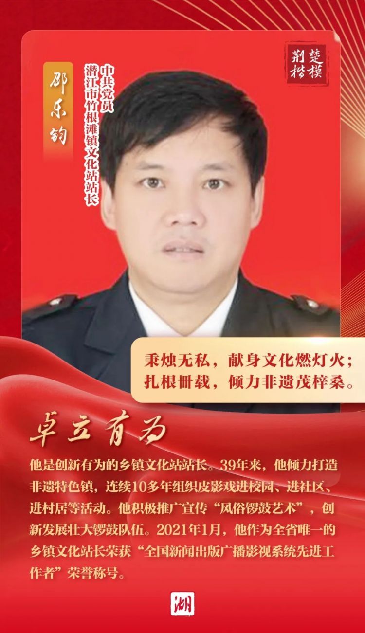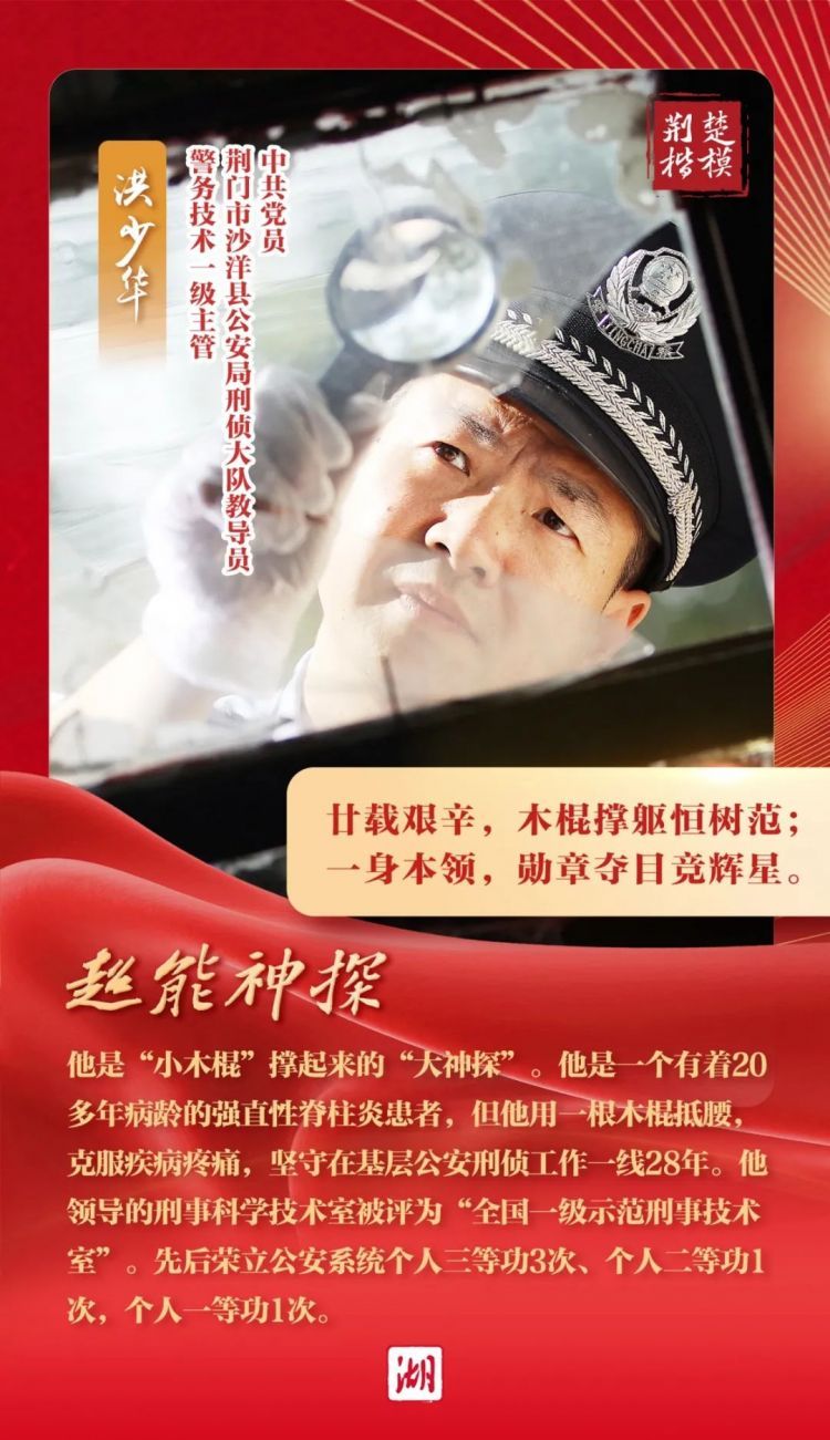 经全省各地各部门层层推荐,省委宣传部组织评审,“荆楚楷模”2023年第四季度上榜人物名单揭晓,其中,中共党员荆门市沙洋县公安局刑侦大队教导员警务技术一级主管洪少华上榜!