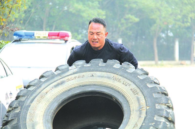 市公安局特警支队常态化开展警务实战大练兵,全面提升民辅警的警事技能和应急处突能力。图为民警正在开展翻转轮胎训练。 (随州日报通讯员刘智明摄)