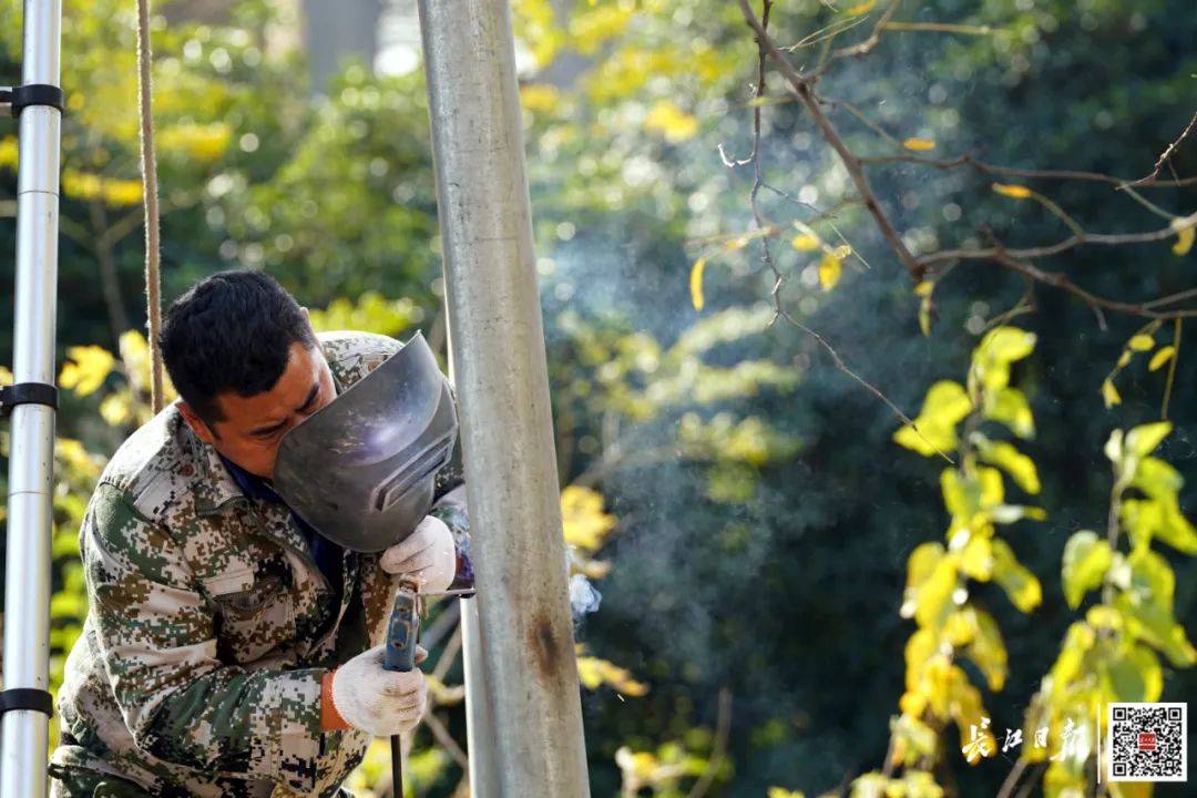 最后,他又给撑起两根主枝的金属支架刷上油漆。这两根支架是半个月前装上的,如同给古皂荚树装上了双拐,防止这“半张皮”被大风刮断。