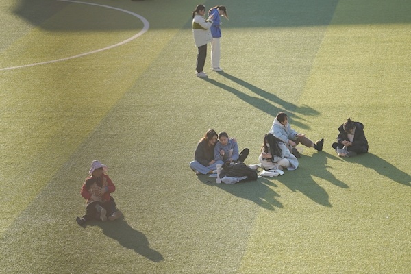 湖北医药学院的学子们在操场上悠闲地晒太阳。