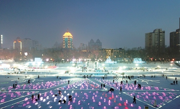 昨日,游客在哈尔滨松花江冰雪嘉年华景区的“冰光秀场”游玩、拍照。