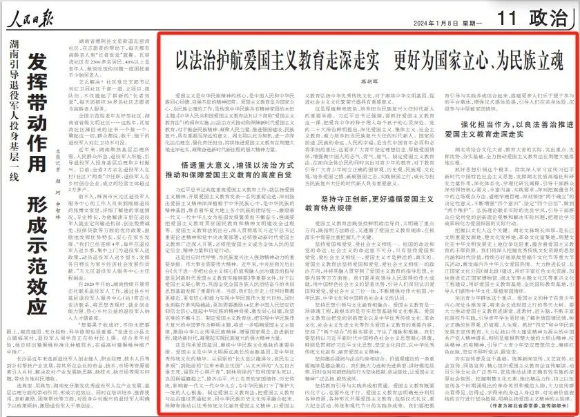 爱国主义是中华民族精神的核心,是中国人民和中华民族同心同德、自强不息的精神纽带。爱国主义教育是为国家立心、为民族立魂的工作,是构筑中华民族共有精神家园的永恒主题。《中华人民共和国爱国主义教育法》(以下简称“爱国主义教育法”)的颁布实施,以法治方式推动和保障新时代爱国主义教育,对于振奋民族精神、凝聚人民力量,推进强国建设、民族复兴,具有重要而深远的意义。湖北将以此为契机,进一步深化法治理念、强化责任担当,持续推进爱国主义教育在荆楚大地走深走实,凝聚奋进新时代新征程的强大精神力量。