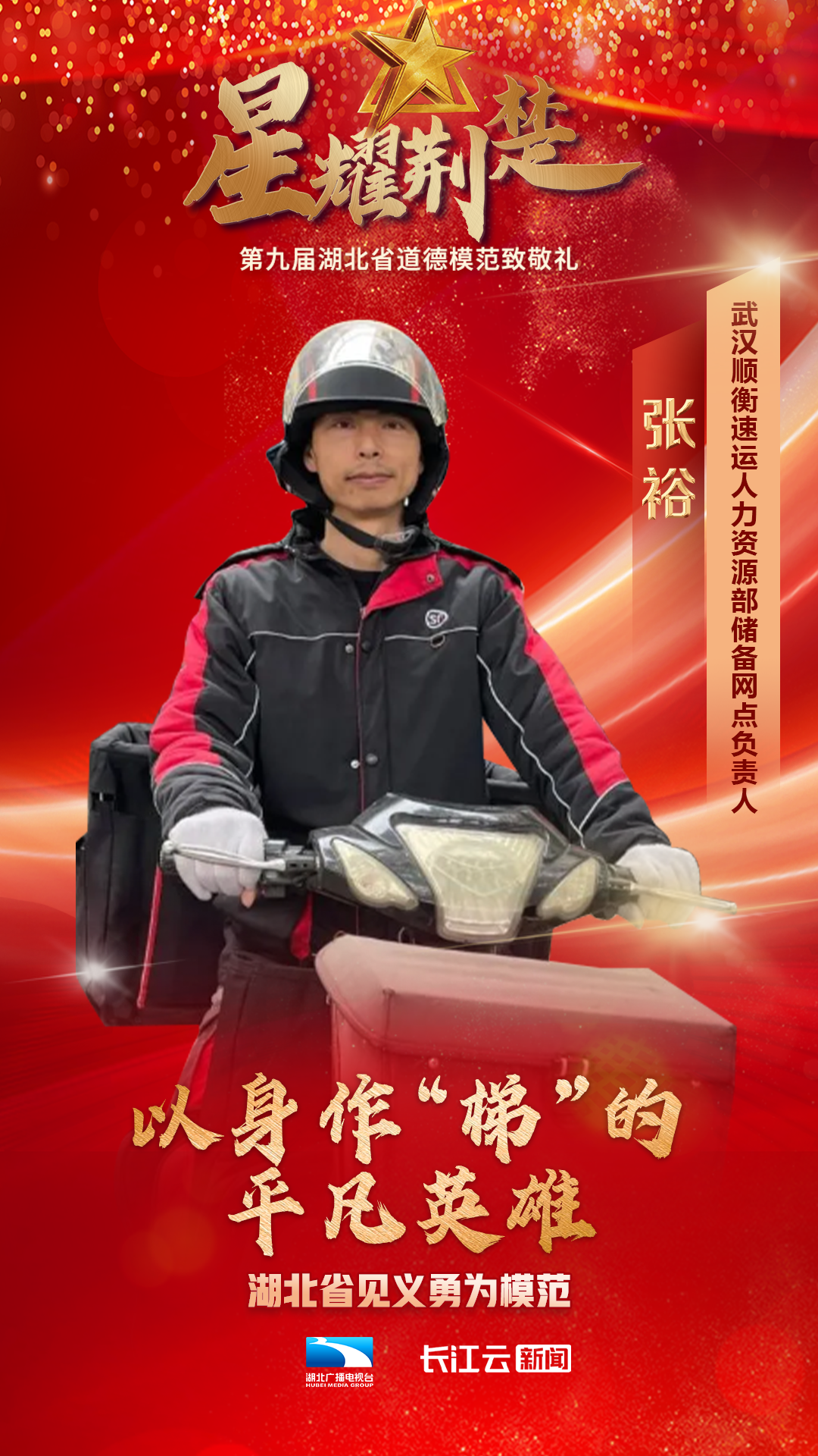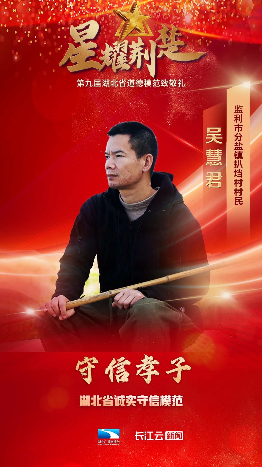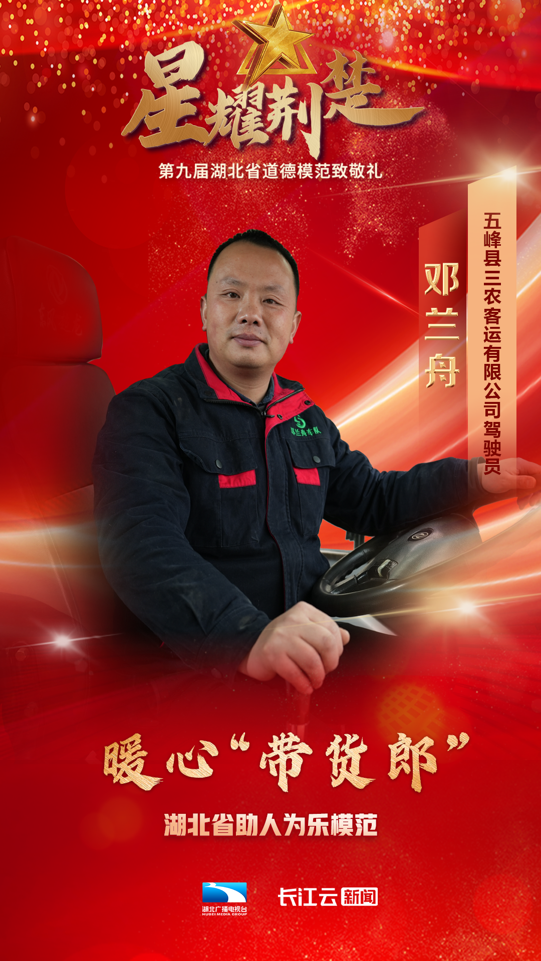 1月10号,由省委宣传部、省文明办、省总工会、团省委、省妇联、省人社厅主办、湖北广播电视台新闻中心承办的星耀荆楚——第九届湖北省道德模范致敬礼在武汉举行,会上公布了第九届湖北省道德模范名单,授予邓兰舟等17名同志、追授王明林等3名同志“湖北省道德模范”称号。