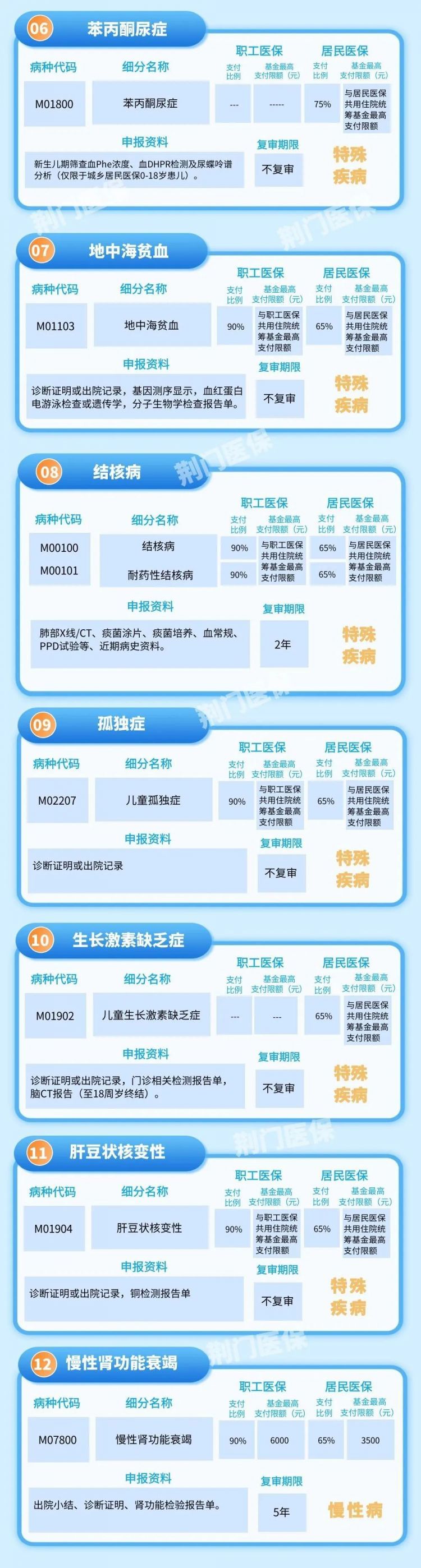 包括恶性肿瘤门诊治疗、慢性肾功能衰竭透析、器官移植抗排异治疗、重性精神病、血友病、苯丙酮尿症、地中海贫血、结核病、孤独症、生长激素缺乏症、肝豆状核变性等病种(含治疗方式)。