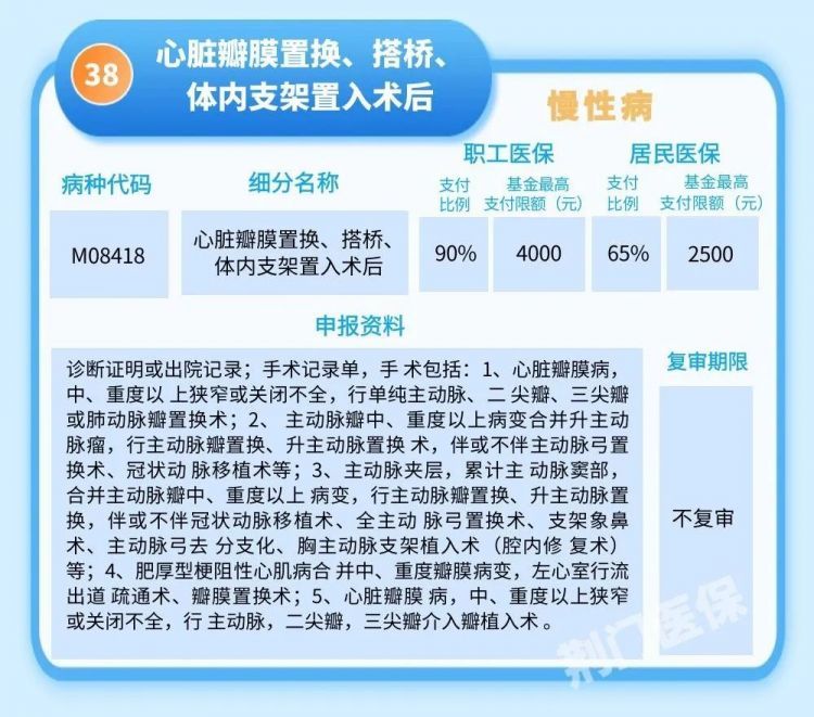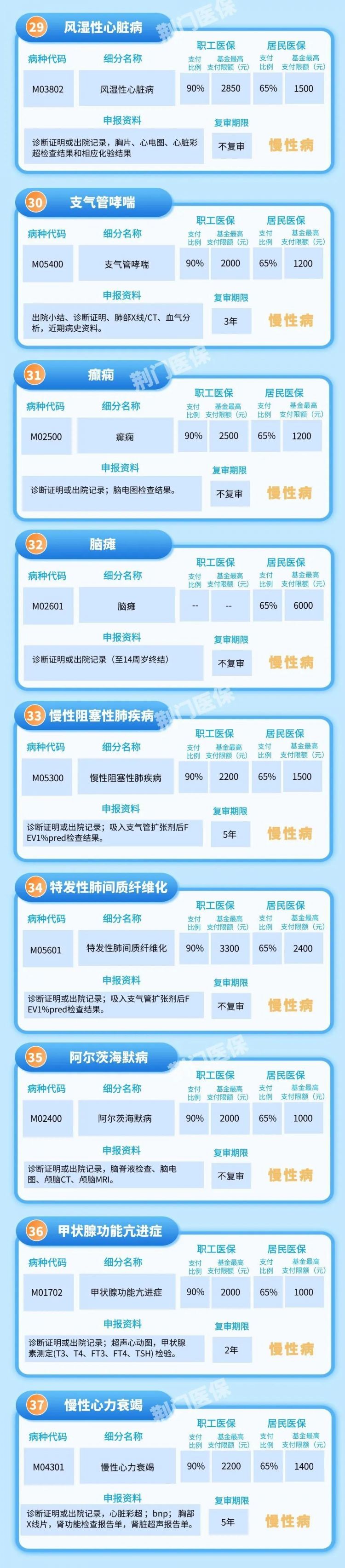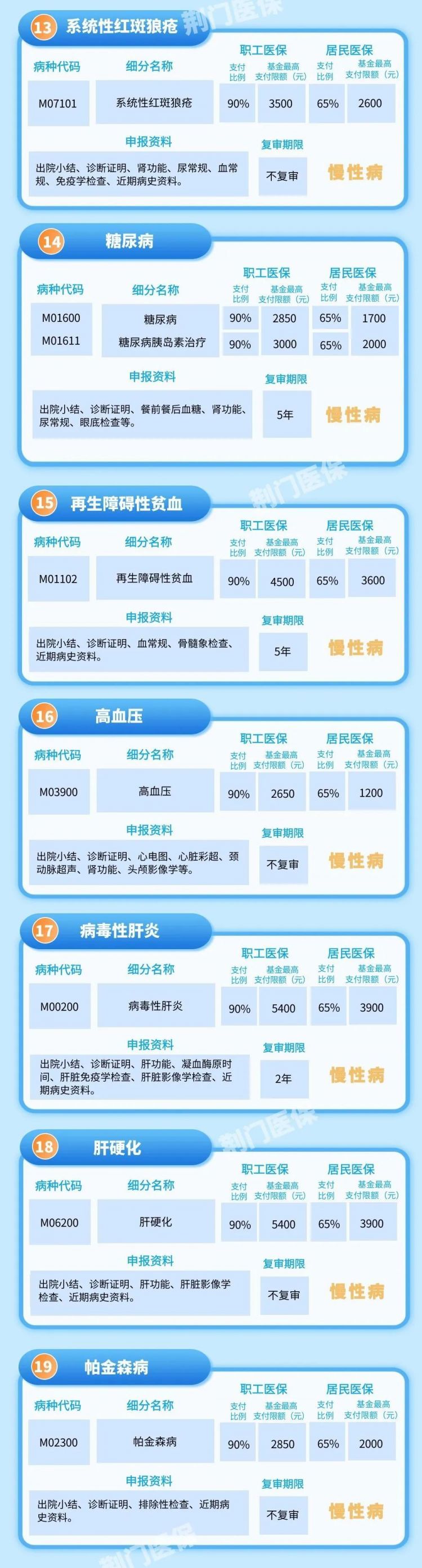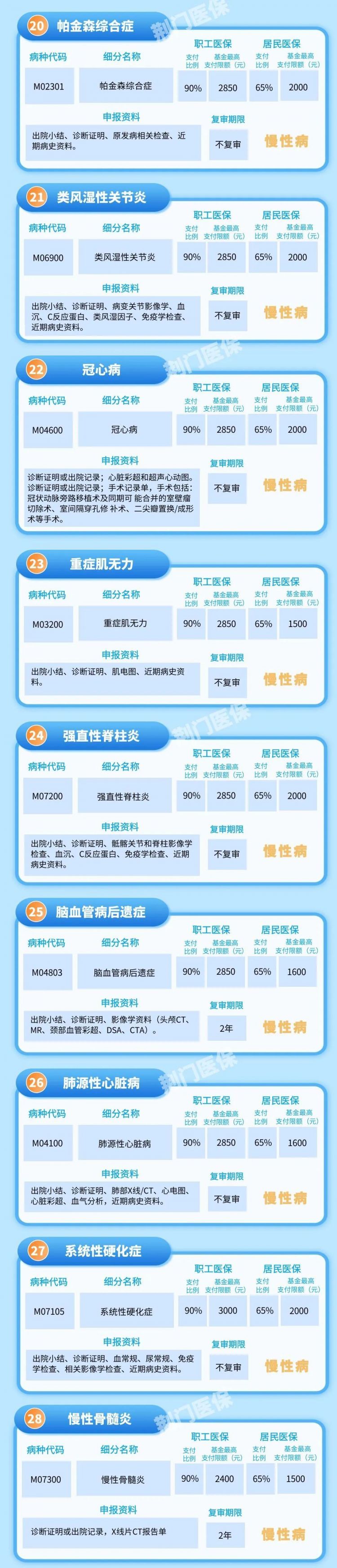包括慢性肾功能衰竭、系统性红斑狼疮、糖尿病、再生障碍性贫血、高血压、病毒性肝炎、肝硬化、帕金森病、帕金森综合症、类风湿性关节炎、冠心病、重症肌无力、强直性脊柱炎、脑血管病后遗症、肺源性心脏病、系统性硬化症、慢性骨髓炎、风湿性心脏病、支气管哮喘、癫痫、脑瘫、慢性阻塞性肺疾病、特发性肺间质纤维化、阿尔兹海默病、甲状腺功能异常、慢性心力衰竭,以及心脏瓣膜置换、搭桥、体内支架置入术后等病种(含治疗方式)。