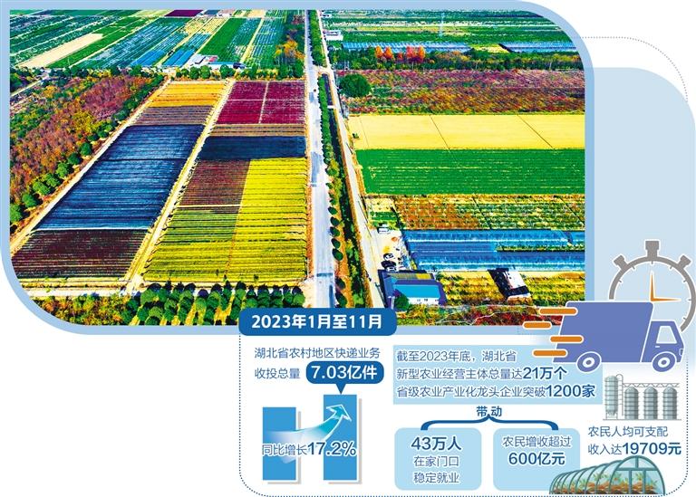 突破性发展乡村产业,还有潜江龙虾、宜昌蜜橘、洪湖莲藕等一批精品名牌,提高了湖北农产品知名度、美誉度和市场占有率,为乡村振兴注入新动能。截至2023年底,湖北新型农业经营主体总量达21万个,省级农业产业化龙头企业数量突破1200家,带动43万人在家门口稳定就业,带动农民增收超过600亿元,农民人均可支配收入达19709元,实现稳步增长。