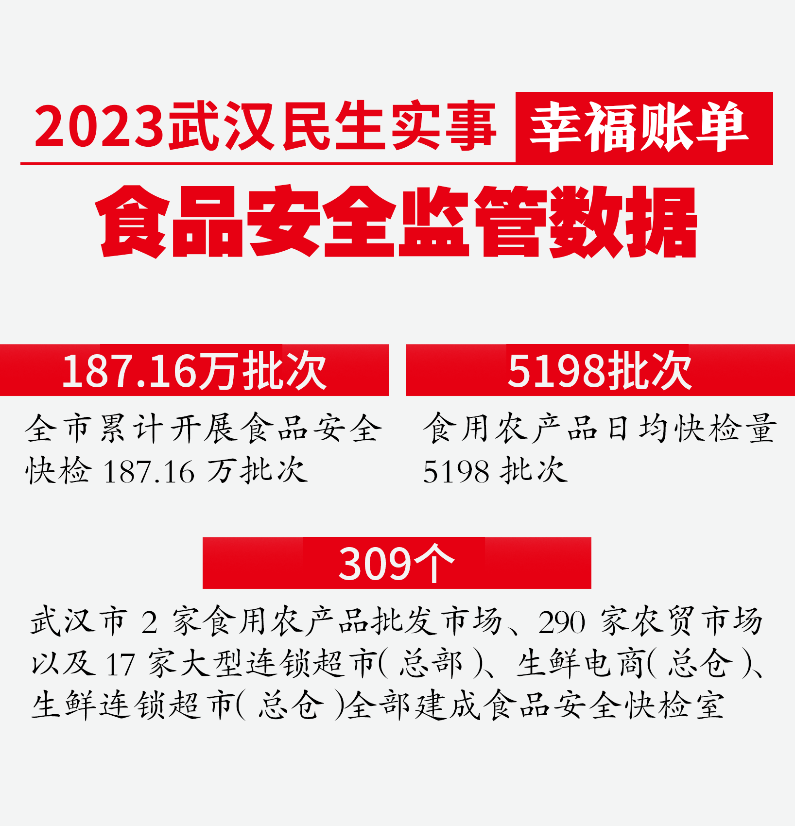 2023年,全市累计开展快检187.16万批次,日均快检量5198批次。其中,全市水产品、生鲜肉类、禽蛋产品、水果等4类产品快检占比达到总批次的15%。武汉市食用农产品快检信息系统已经建成并投入使用,实现全市食用农产品快检数据实时上传率、结果实时公示率、不合格产品实时处置率100%。
