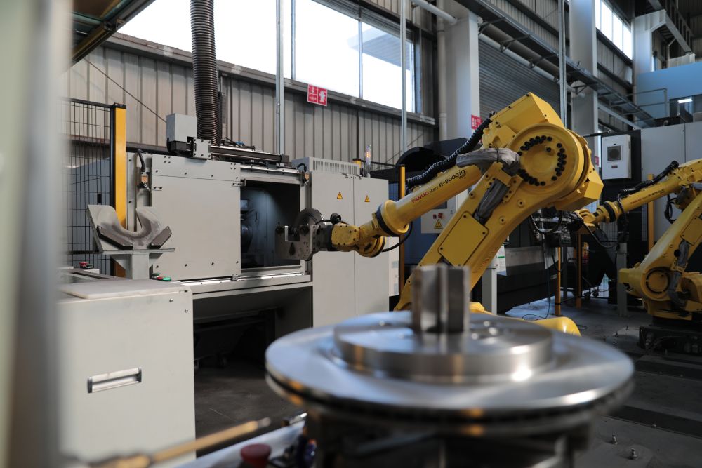 在摩擦一号制动科技(仙桃)有限公司三号工厂里,机器人在制作刹车盘。(张勋 摄)