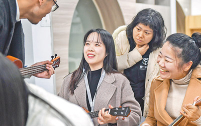 学员们向汪阔林(左一)学习弹奏尤克里里。