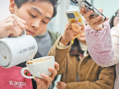 在武汉市硚口区古田坊一家咖啡店,教师戴辉演示咖啡拉花。