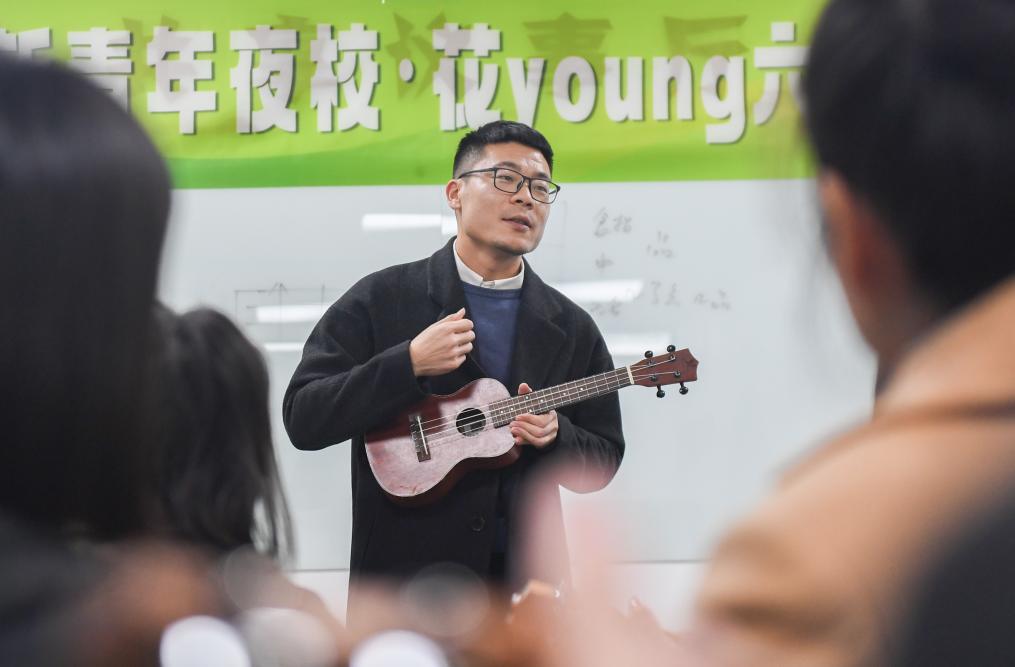 除了拓展兴趣爱好、交朋友,夜校也是青年们繁忙之余得以小憩的精神“桃花源”。“现在有家庭的人可能都是给孩子报班,但是自己很少报班。夜校课程像是生活调味剂,让大家兼顾工作和家庭之余能够调节自己,学一些感兴趣的东西。”尤克里里课程教师汪阔林说。